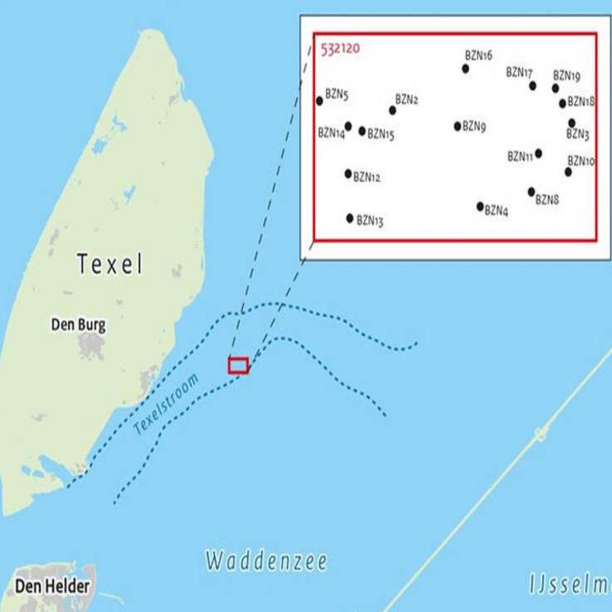 Texel, de Waddenzee en de locatie van de Burgzand Noord wrakken. Beeld: RCE