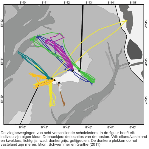 In eerder onderzoek werd vastgesteld dat scholeksters behoorlijk honkvast zijn met betrekking tot de plek waar ze hun voedsel vergaren. En hoewel de meeste individuen inderdaad naar hun eigen vaste stek gingen, maakten sommige toch af en toe een uitje naar een hele andere plek (zie figuur). Eén scholekster (aangeduid met lichtgeel) vloog tijdens vloed zelfs kilometers ver naar een meertje op het vasteland om eten te zoeken. Op de figuur is verder te zien dat de meeste vogels vooral tripjes naar de twee nabij gelegen getijgeulen maakten. Hier zitten namelijk veel schelpdieren. De vogels hielden uiteraard ook rekening met het getij want alleen op drooggevallen wad kunnen ze goed voedsel verzamelen. Scholeksters zijn vooral langs de waterlijn te vinden. Als een plaat net droog komt te liggen, is het namelijk een goed moment om bijvoorbeeld nonnetjes te vangen.