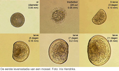 Nederlandse en Franse wetenschappers namen de effecten van verzuring op de groei van piepjonge mosselen onder de loep. Het onderzoek werd gedaan in Zeeland, bij mosselkwekers. De larven werden in bakken met zeewater opgekweekt die werden belucht met gewone lucht of met CO2 verrijkte lucht. Zo werden drie verschillende pH-waardes verkregen: 8,2, 7,8 en 7,6. Een pH van ongeveer 7,8 had nog geen negatief effect op het aantal uitgekomen eieren en op de sterfte in de eerste twee weken van de ontwikkeling. Maar er was wel een duidelijk effect op grootte van de schelpen. Ze bleven 6% kleiner. Ook waren de schelpen 12% minder dik. Bij een verdere verlaging van de pH naar 7,6 kwamen er 24% minder eieren uit. En nu waren de schelpen maar liefst 13% kleiner. De verklaring achter deze sterkere effecten is dat de pH van het zeewater nu zo laag was dat er een afname optrad van de calcificatie. Het zeewater is bij deze pH namelijk licht onderverzadigd voor het kalkrijke aragoniet, de belangrijkste bouwstof van de mosselschelpen.