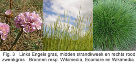 Een deel van de planten die op de kwelders groeien, verspreiden hun zaad ook via de zee. Dat geldt vooral voor planten die lager op de kwelder leven. De vegetatie op kwelders wordt gekenmerkt door een duidelijke zonering (kijk hier voor meer informatie). Laag op de kwelder groeien zoutminnende soorten als zeekraal en Engels slijkgras. Midden op de kwelder overheersen lamsoor, zeeweegbree, schorrenkruid, zeealsem, zoutmelde en zeeaster. Planten hoog op de kwelder of aan de voet van de duinen kunnen minder goed tegen zout water, zoals Engels gras, rood zwenkgras en strandkweek (figuur 3).