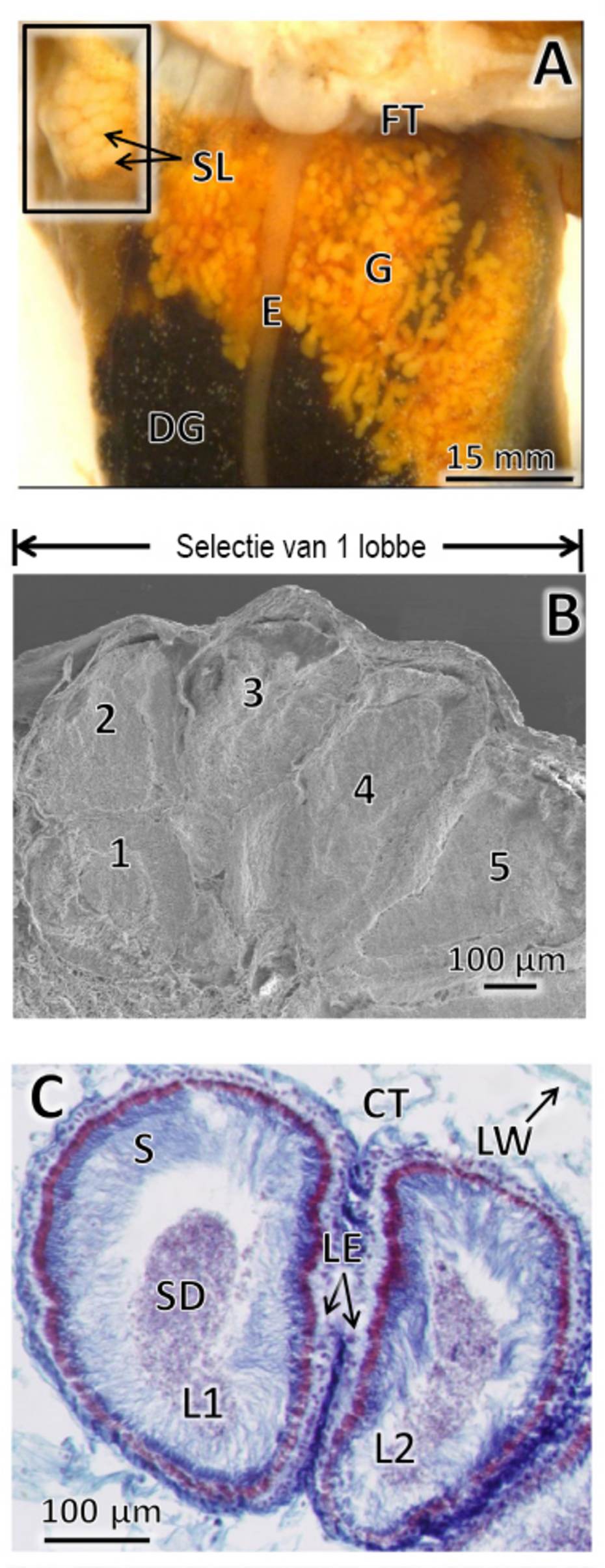 De onderzoekers hebben met behulp van een elektronenmicroscoop deze parkeerplaats voor zaadcellen van tien vrouwelijke muiltjes bekeken. De zaadopslaglobben bestaan uit negen tot elf verschillende lobben. Elk van deze lobben bestaan weer uit verschillende kwabben en juist deze kwabben blijken zo bijzonder te zijn. Elke kwab kan onafhankelijk van elkaar zaadcellen opslaan en ook weer onafhankelijk van de andere kwabben vrijgeven voor bevruchting. Doordat het muiltje vele opslagkamers heeft en deze onafhankelijk van elkaar kan legen, verwachten onderzoekers dat dit een reden kan zijn dat het muiltje een zeer lange voortplantingsperiode heeft. Tevens denkt men dat dit een grote rol speelt in de efficiënte reproductie en de succesvolle invasie van het muiltje.
