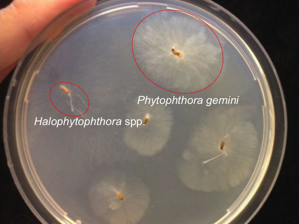 Schimmels uit de Phytophthora-familie zijn zeer besmettelijk en leiden over het algemeen tot ernstige ziekteverschijnselen. Van de zaden van het Groot zeegras uit Sylt, dat gebruikt is voor de herstelprojecten in de Waddenzee (zie WadWeten Zeegrasherstel), bleek 99% besmet te zijn. Op andere plaatsen bleek besmet zaad niet meer kiemkrachtig te zijn. In een laboratorium zijn proeven gedaan met Phytophthora-besmetting, in relatie tot potentieel belangrijke sturende omgevingsfactoren, zoals sedimenttype, wintertemperatuur en transporttemperatuur. Daarnaast is een ontsmettingsmethode getest. Uit de experimenten bleek dat Phytophthora het beter deed in zandig dan slibbig sediment en beter onder koude dan warmere wintertemperaturen. Behandeling met ethanol om besmetting te beperken bleek niet effectief. Aanbevolen werd om te investeren in de ontwikkeling van een methode die Phytophthora-besmetting uitschakelt of vermindert.